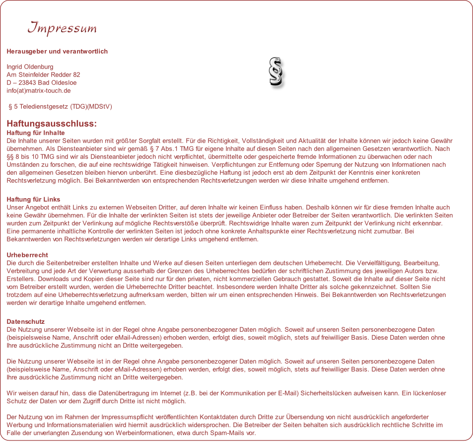 copyright © 2010    Matrix Touch - designed by G. Landahl Unsere Arbeit versteht sich als Ergänzung, keinesfalls als Ersatz für den Arzt oder Heilpraktiker Ihres Vertrauens! Wir stellen weder Diagnosen noch geben wir Heilversprechen ab.